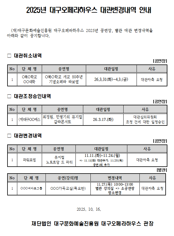 | 이전글 | 25년 12월, 26년 상반기 대구오페라하우스 대관 심의결과 안내 |