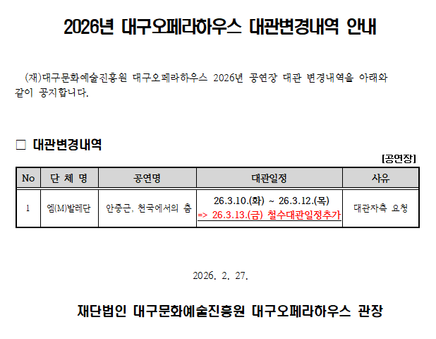 2026년 대구오페라하우스 대관변경내역 안내