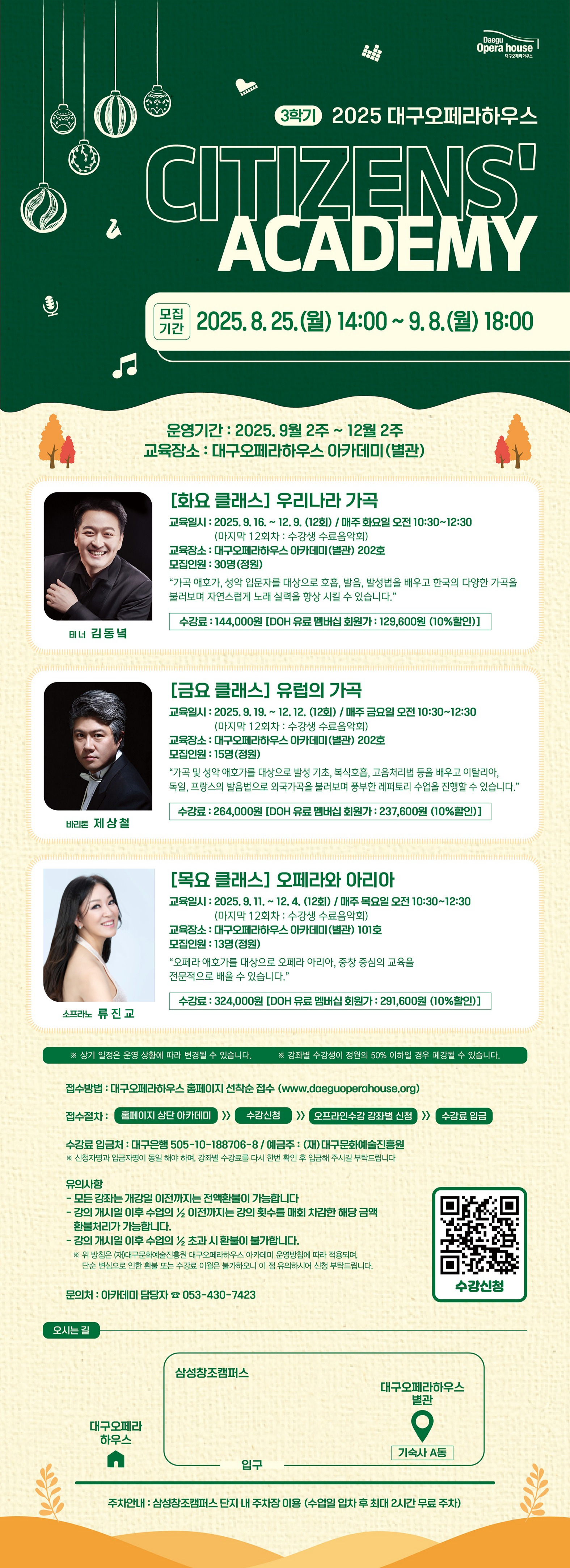 ![]() 대구오페라하우스 2025년 시민아카데미의 3학기 수강생을 모집하오니 많은 관심 부탁드립니다! ○ 모집기간 : 2025. 8. 25.(월) 14:00 ~ 9.8.(월) 18:00 까지 ※ 선착순 정원 초과 시 조기 마감 될 수 있습니다. ○ 접수방법 : 홈페이지 직접 접수 * 선착순 접수로 형평성을 위해 전화접수는 불가하오니 양해바랍니다. ○ 운영기간 : 2025. 9월 2주 ~ 12월 2주 *3개월단위 운영 ○ 운영장소 : 대구오페라하우스 별관 ○ 강좌내용 1. 우리나라 가곡 (매주 화요일 10:30~12:30) - 총 12회(9. 16. ~ 12. 9.) - 수강료 144,000원 / 김동녘강사 (반주자 : 박선민) - 정원 30명 2. 유럽의 가곡 (매주 금요일 10:30~12:30) - 총 12회(9. 19. ~ 12. 12.) - 수강료 264,000원 / 제상철강사 (반주자 : 서인애) - 정원 15명 3. 오페라와 아리아 (매주 목요일 10:30~12:30) - 총 12회(9. 11. ~ 12. 4.) - 수강료 324,000원 / 류진교강사 (반주자 : 박현정) - 정원 13명 * 상기 일정은 운영상황에 따라 변경될 수 있습니다. ▼수강 신청▼ (8월 25일 14:00 부터 신청 가능!!)