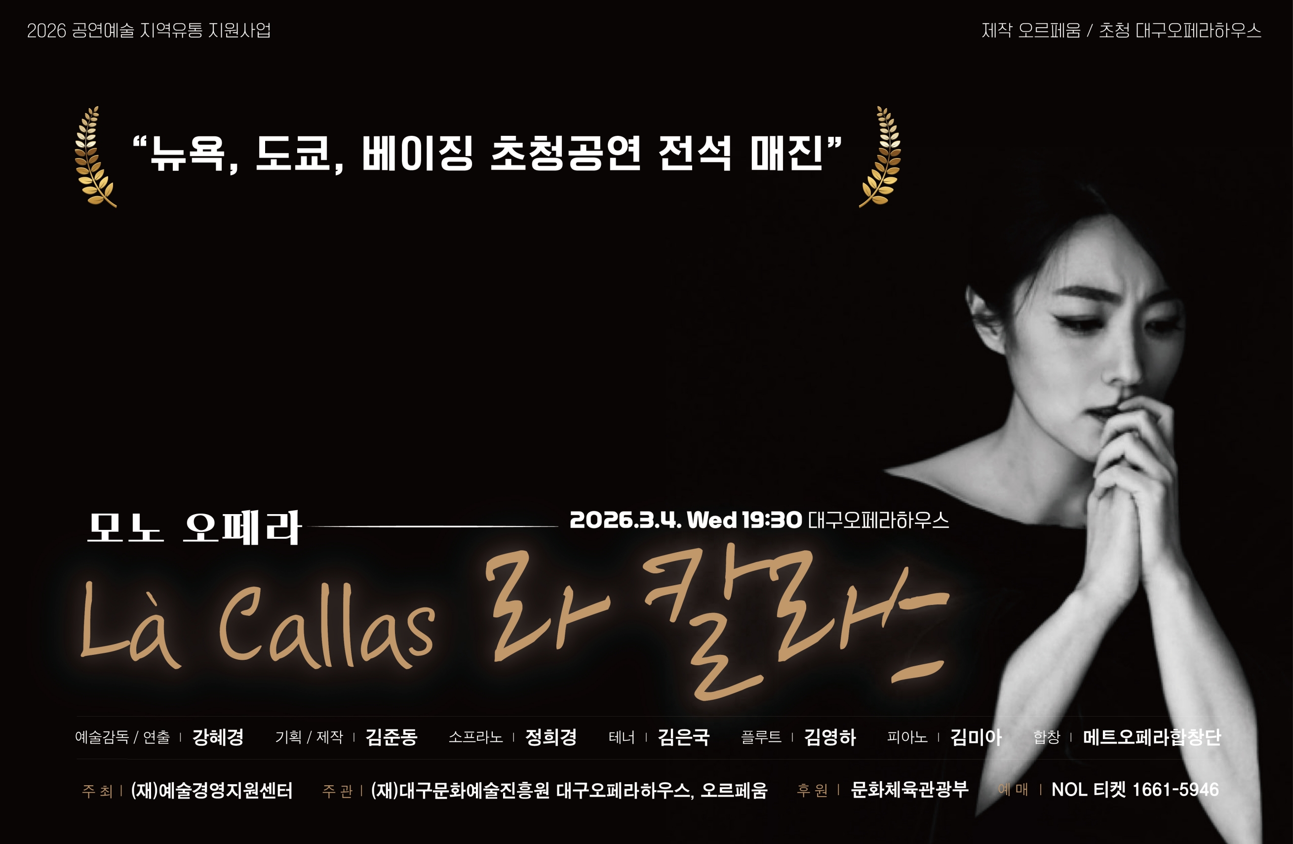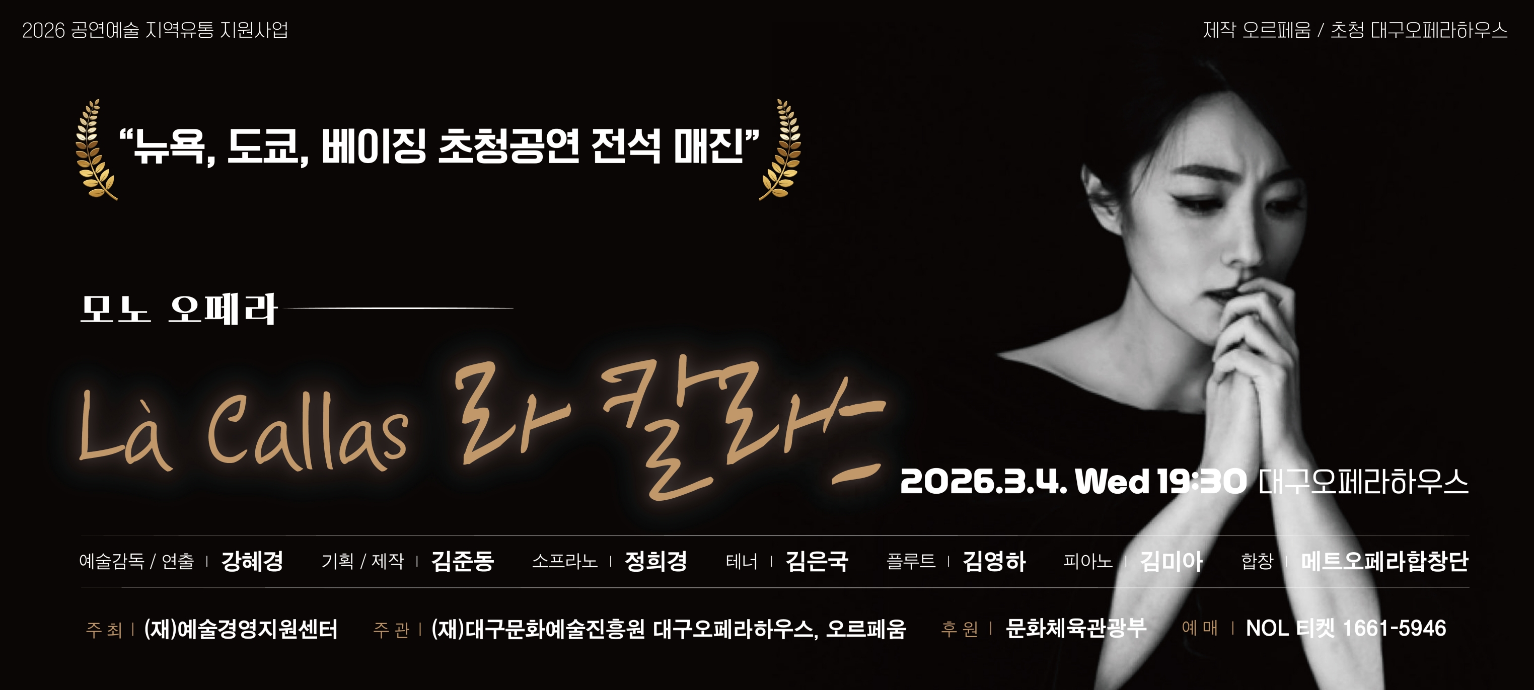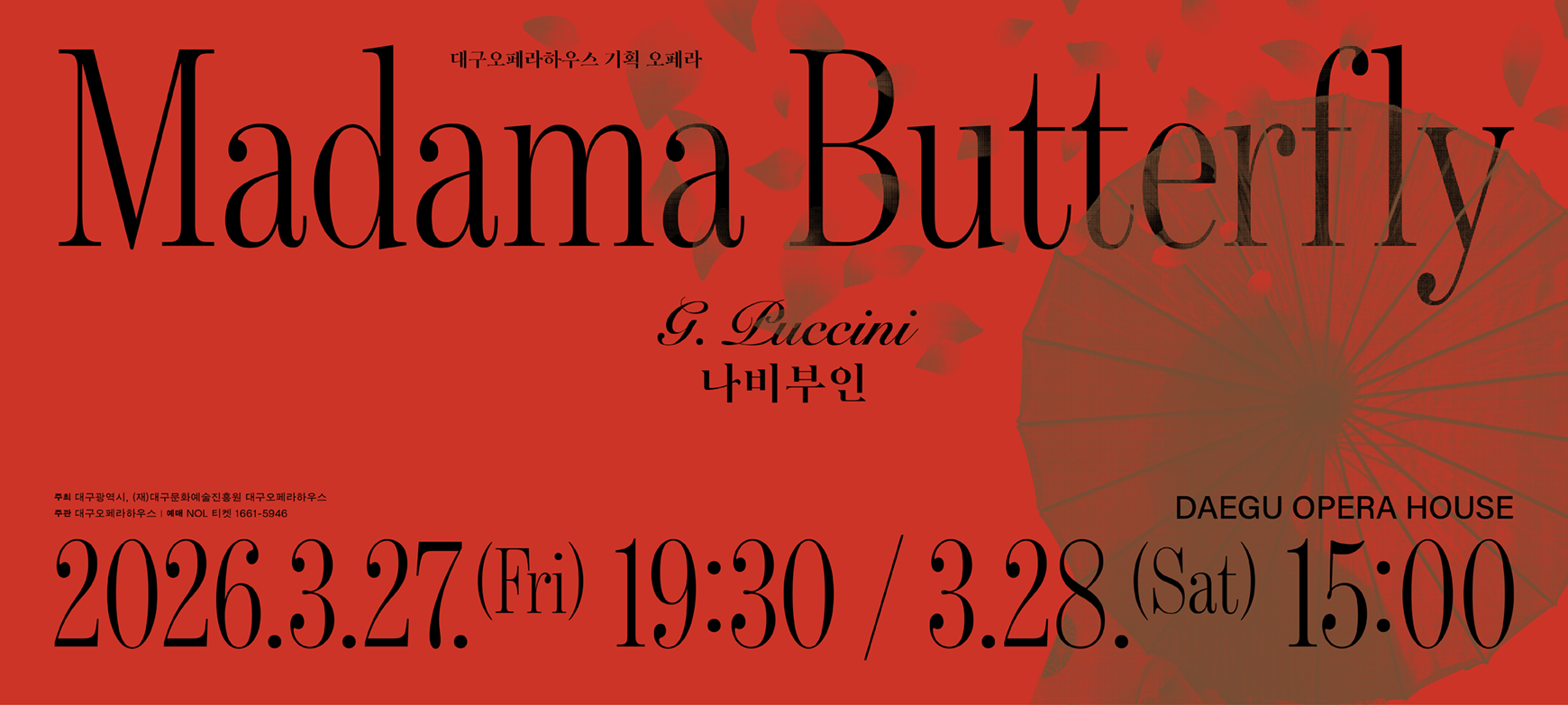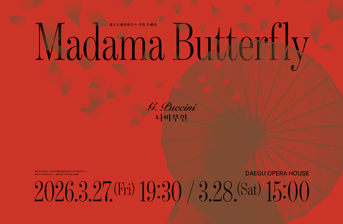 NOTICE 공지사항 모집안내 오디션신청 상시오디션 2023년 대구오페라하우스 경비용역 입찰 공고202212-122023년 대구오페라하우스 청소용역 입찰 공고202212-122022 오페라 <심청> 무대세트 제작설치 및 철거202210-112022 오페라 <투란도트> 무대세트 제작설치 및 철거202208-092022년 (재)대구오페라하우스 경비용역 입찰공고202112-062022년 (재)대구오페라하우스 청소용역 입찰202112-06대구문화예술진흥원 원장 공개모집(재공고)202209-22대구문화예술진흥원 원장 공개모집 공고202208-22(재)대구오페라하우스 제2차 직원 채용 면접시험 합격자 공고202206-02(재)대구오페라하우스 제2차 직원 채용 면접시험 대상자 안내 및 장소 공고202205-24(재)대구오페라하우스 제2차 직원 채용 필기시험 합격자 발표 및 서류제출 안내202205-18(재)대구오페라하우스 제2차 직원 채용 필기시험 대상자 발표 및 시험 안내202205-12NEW2026 달빛동맹 오페라 〈라 보엠〉 온라인 프로그램북202601-292026 대구오페라하우스 오펀스튜디오 성악가 선발 오디션 공고202601-19[프리마 델라 프리마] 2026 달빛동맹 오페라 <라 보엠> 특별 강의 신청 안내202601-14[상시오디션] 세부스케줄 공지 (2025. 12. 15-16)202512-12상시오디션 참석자 명단(25. 12. 15. ~ 16.)202512-112026년 대구오페라하우스 상주예술단체-오케스트라, 합창단 선정 공모(기간 연장)202511-27대구오페라하우스 상주단체 <대구오페라콰이어> 단원모집 공고202411-072024년 대구오페라하우스 하우스어셔 합격자 안내202408-09대구 오페라 유스콰이어 단원 모집202408-07디오오케스트라 2차 연수단원 모집공고202408-06대구오페라하우스 하우스어셔 면접전형 안내202408-01대구오페라하우스 하우스 어셔 모집공고202407-152026 대구오페라하우스 오펀스튜디오 성악가 선발 오디션202601-192025 대구오페라하우스 오펀스튜디오 성악가 추가 선발 오디션202504-092025 대구오페라하우스 오펀스튜디오 성악가 선발 오디션202501-102024 대구오페라하우스 오펀스튜디오 성악가 선발 오디션202401-152026 대구오페라하우스 [상시오디션]202006-19 view all DOH ACADEMY 아카데미 전문적이고 차별화 된 대구오페라하우스의 아카데미 교육프로그램을 만나보세요. 아카데미 안내Academy 오페라 전문가양성Expert 시민아카데미Citizen 수강신청Register GLOBALIZATION OF KOREAN OPERA