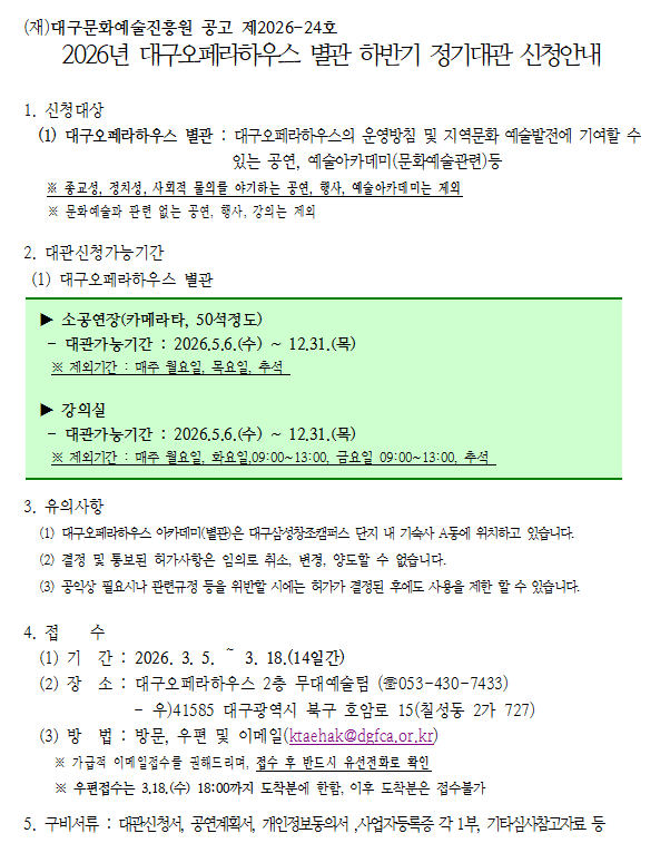 2026년 대구오페라하우스 별관 하반기 정기대관 신청안내