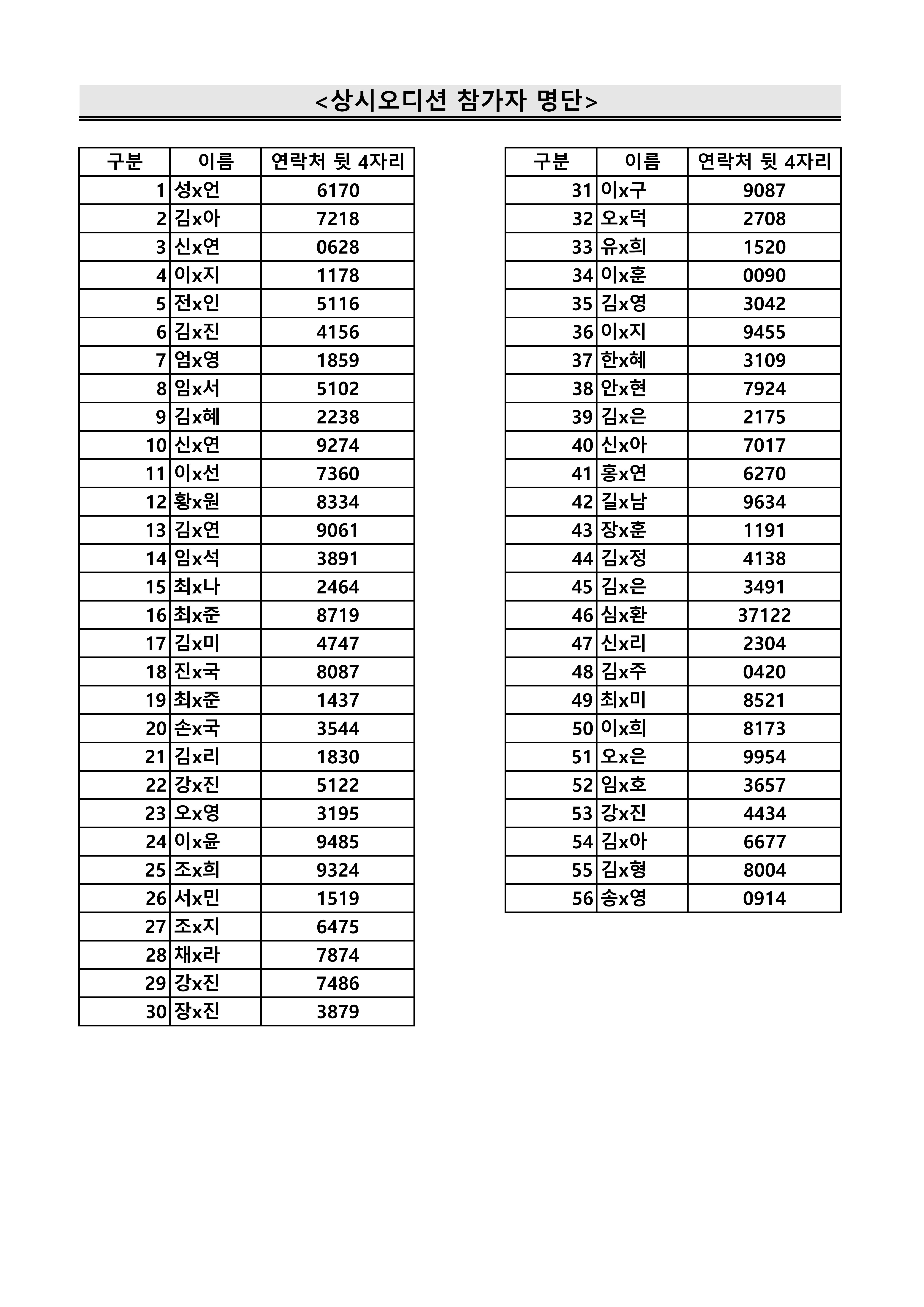 1차 동영상 심사를 거쳐 2025 마지막 상시오디션에 참석할 최종 명단을 공지드립니다. 자세한 날짜와 시간은 12월 12일 금요일 오후 2시 전까지 개별 문자로 안내드릴 예정입니다. 상시오디션은 2026년에도 신청자 인원에 따라 상시로 개최될 예정입니다. 감사합니다.