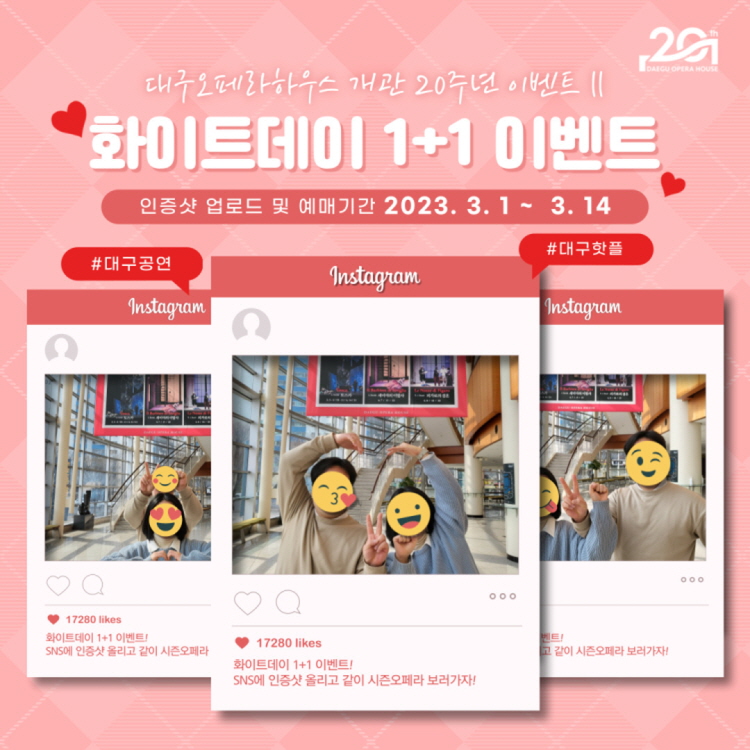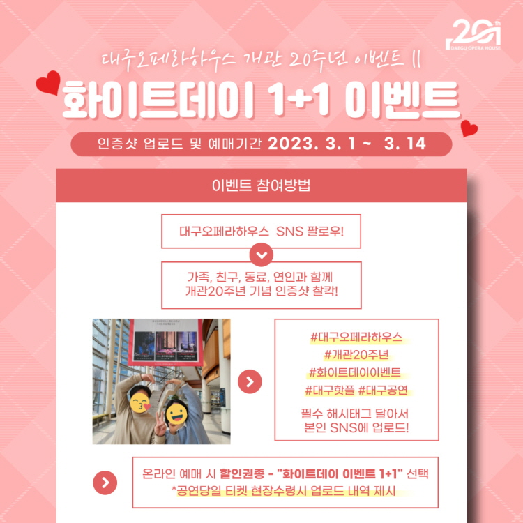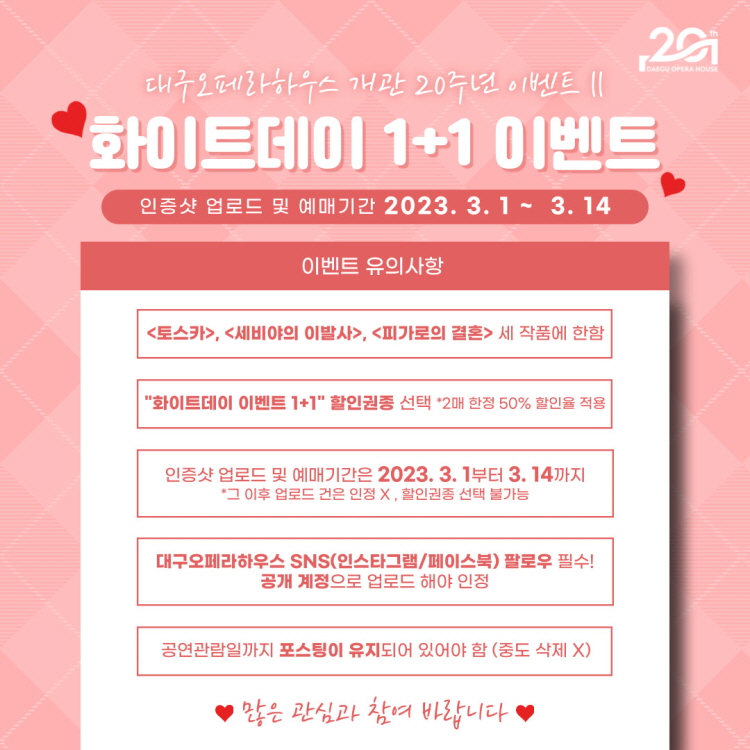 성원에 감사드립니다. 3.1~3.14일 내에 예매하신 분들은 공연관람 당일 SNS 업로드 내역을 제시하여 주셔야 합니다. (미 제시시 차액지불) [대구오페라하우스 개관 20주년 이벤트Ⅱ] 화이트데이 1+1 이벤트 연인, 가족, 친구들과 함께 공연보러가자 ① 필수 해시태그와 함께 개관 20주년 기념 인증샷 SNS 업로드 *인증사진 : 2명이서 숫자 20을 표현해 주세요 ② 인증샷 업로드 및 예매 기간 : 3.1(수) - 3.14(화) 까지 ③ <토스카> <세비야의 이발사> <피가로의 결혼> 중 원하는 공연 1+1 예매 GO GO!! ④ '화이트데이 이벤트 1+1' 할인권종 선택하여 2장 예매 ⑤ 공연당일 티켓 수령시 업로드 내역 제시 * 좀 더 자세한 내용은 위 이미지의 참여방법 및 유의사항을 확인해 주세요:) ![]() ![]() ![]() |