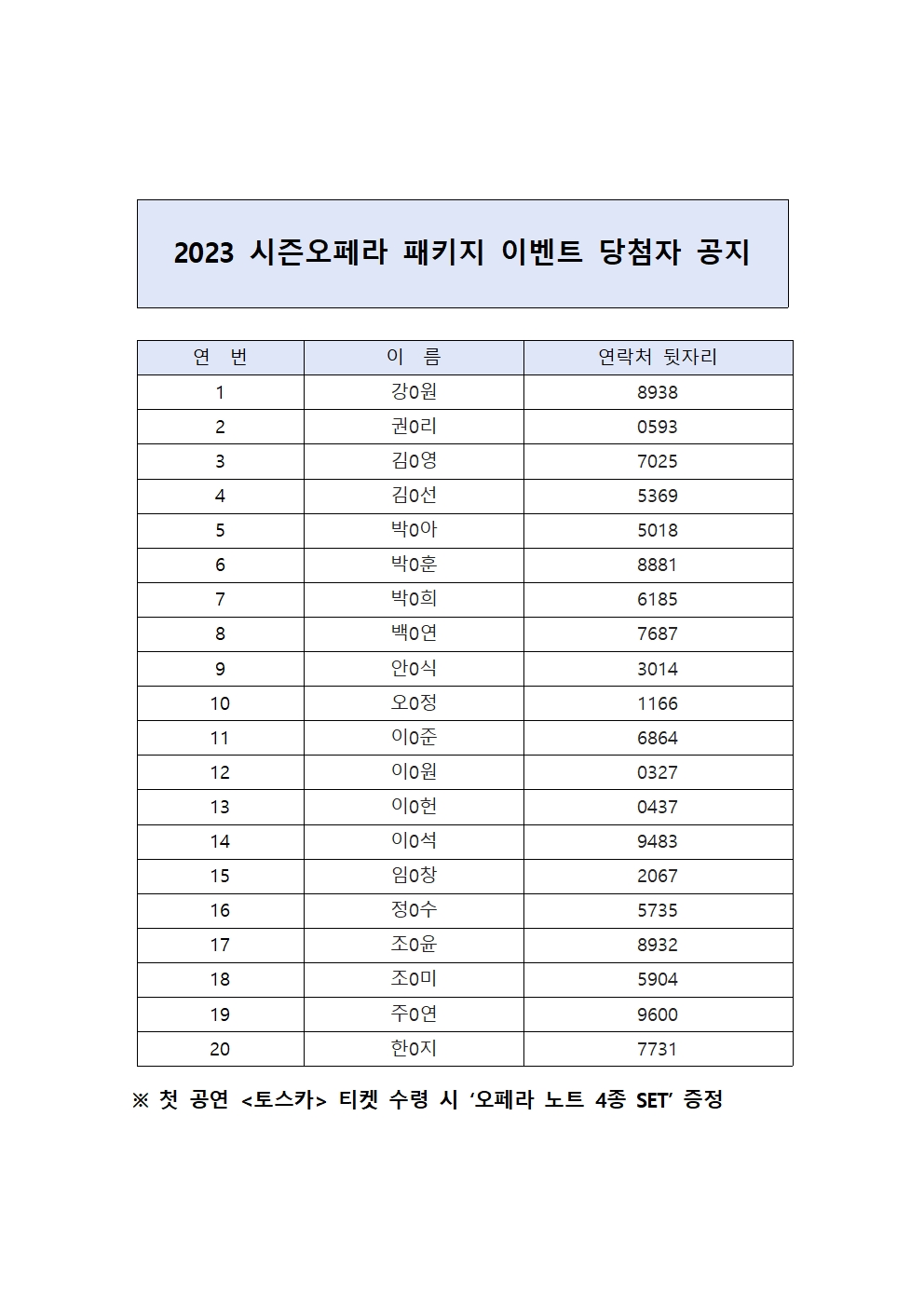 2023 시즌오페라 패키지 이벤트 당첨자 공지