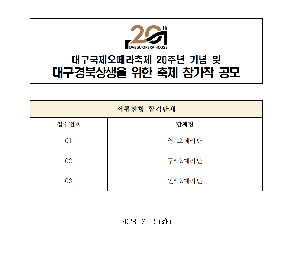 대구국제오페라축제 20주년 기념 및 대구‧경북상생을 위한 축제 참가작 공모 - 1차 서류합격단체 발표